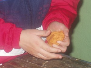 Réalisation: Pour commencer prenez la planchette et la pâte à modeler,malaxez là.Avec un rouleau aplatissez la pâte à modeler sur la planchette. Faites une forme.Prenez votre fruit et votre feuille ou votre fruit et votre rameau. Faites un boudin qui servira à faire le tour de la forme. |